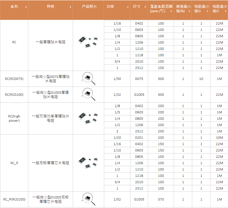 国巨RC系列厚膜电阻包括了:常规厚膜电阻、小型0075厚膜贴片电阻、小型01005厚膜贴片电阻、大功率厚膜贴片电阻、无铅厚膜贴片电阻。