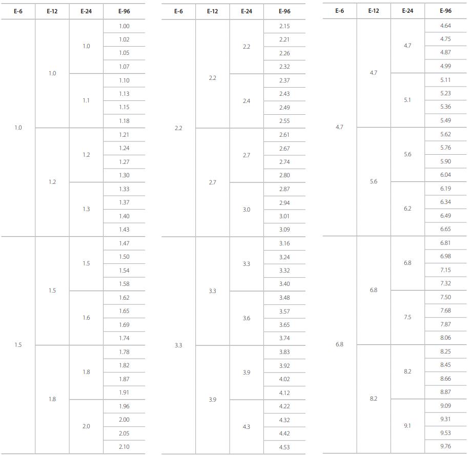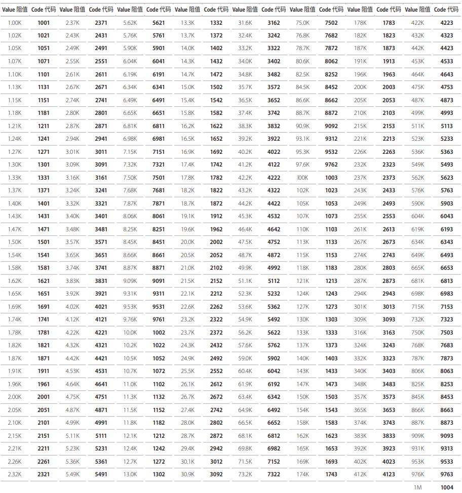下表列出每种系列的厚声电阻的标准阻值,表中的阻值是按照通用倍率得出的接近阻值。