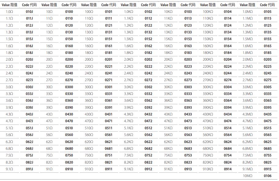 E-24 系列标准厚声电阻阻值和料号系统使用代码 ( 4 位 , 以 0 为首位 , 2%、5%、10% 公差 )