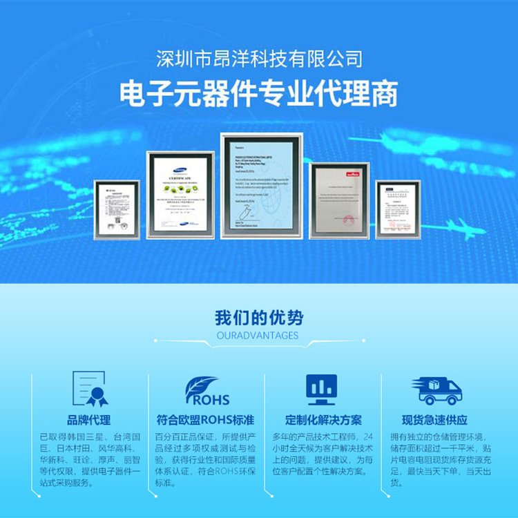 昂洋科技深耕电子元器件行业二十年,代理三星、村田、国巨、风华高科等全球知名品牌,产品覆盖贴片电容、电阻、电感、磁珠等被动元件,以及IC、传感器等主动器件。其核心优势在于: