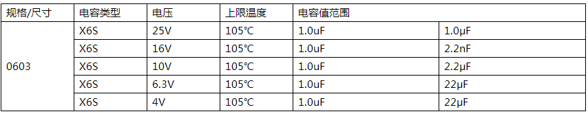 以上是国巨CC X6S 0603 贴片电容的常用参数表。