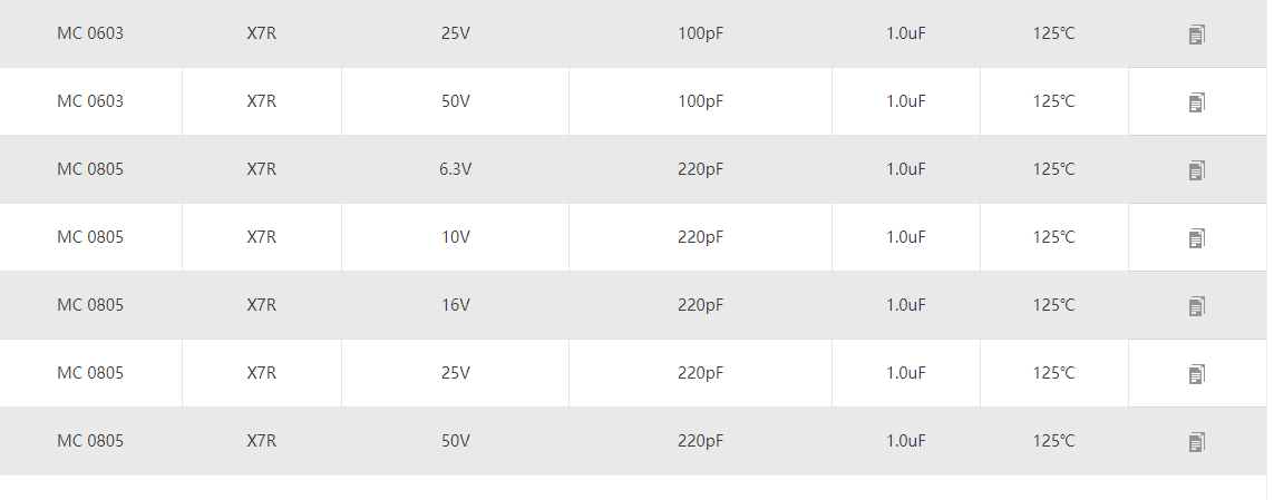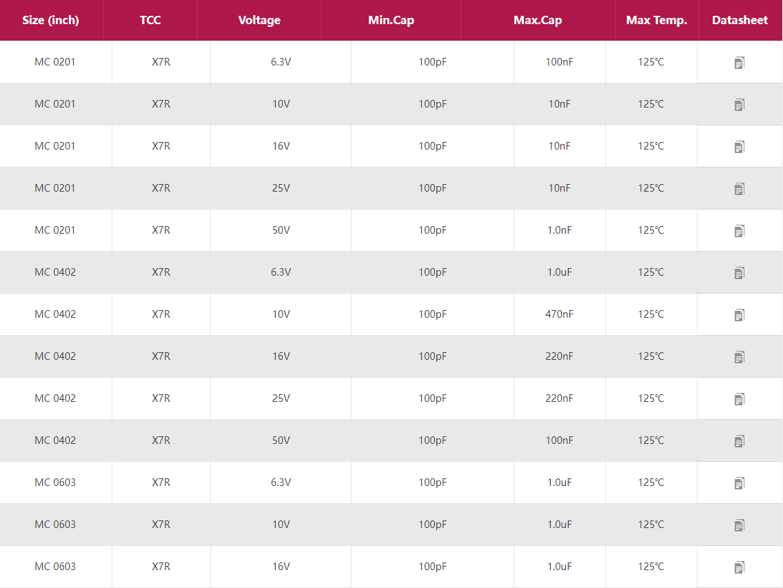 MC:X7R通用电容 产品型号:0201 0402 0603 0805